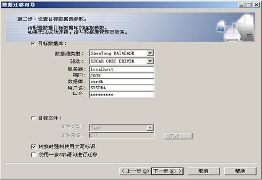 另外,神通数据库迁移工具还支持目标数据源为文件类型,文件类型主要有:Text、Excel、SQL、XML、DEL。下面以神通数据库为目标数据源进行参数设置;神通数据库运行在本机,所以服务器设置为localhost;神通数据库默认端口为2003;数据库为OSRDB;用户名和密码分别为sydba和szoscar55(注:用户名不区分大小写,密码区分大小写)。具体参数配置如图5所示。